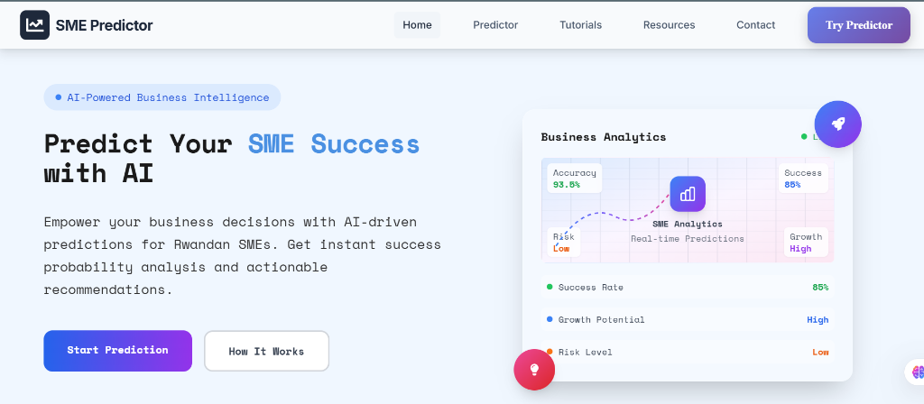 AI-powered platform predicting SME success for Rwandan businesses — 93.5% accuracy, real-time risk and growth analysis.